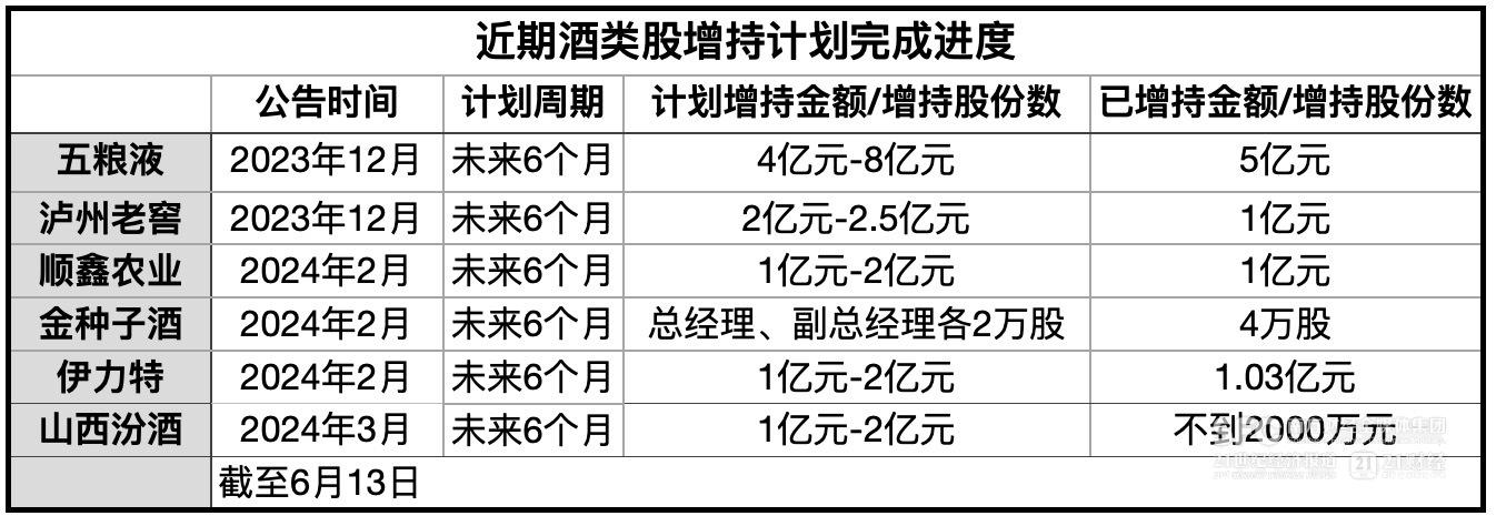 21世纪经济报道记者统计梳理注意到,截至6月13日收盘,这17家提出增持或回购的上市酒企中,已经有五粮液(000858)、舍得酒业(600702)、百润股份(002568)、水井坊(600779)等9家达标,但也有酒企进度缓慢,如岩石股份(600696)提出回购以来一股未买。