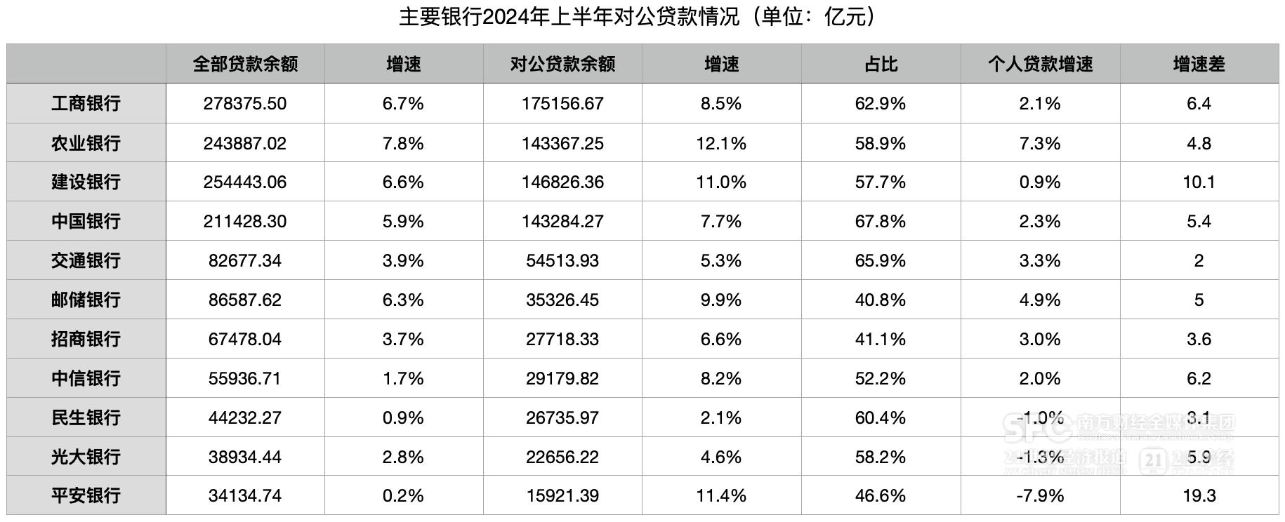 从对公贷款余额看,四大行绝对领先,均超过14万亿元,其中工商银行(601398)达到175156.67亿元,其他三家为14万亿多元;交通银行(601328)为54513.93亿元,邮储银行35326.45亿元,股份行均低于3万亿元。