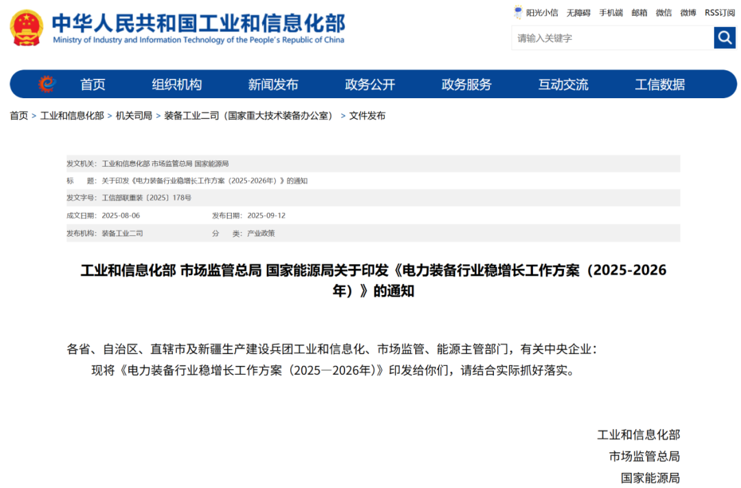 9月12日,工业和信息化部、市场监管总局、国家能源局发布了《电力装备行业稳增长工作方案(2025—2026年)》(以下简称《工作方案》)。