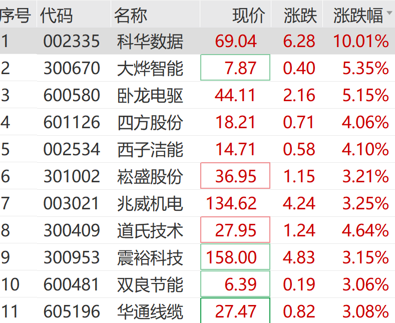 9月12日盘初,电力设备板块局部走高,科华数据(002335)直线拉涨停,大烨智能(300670)、卧龙电驱(600580)等跟涨。