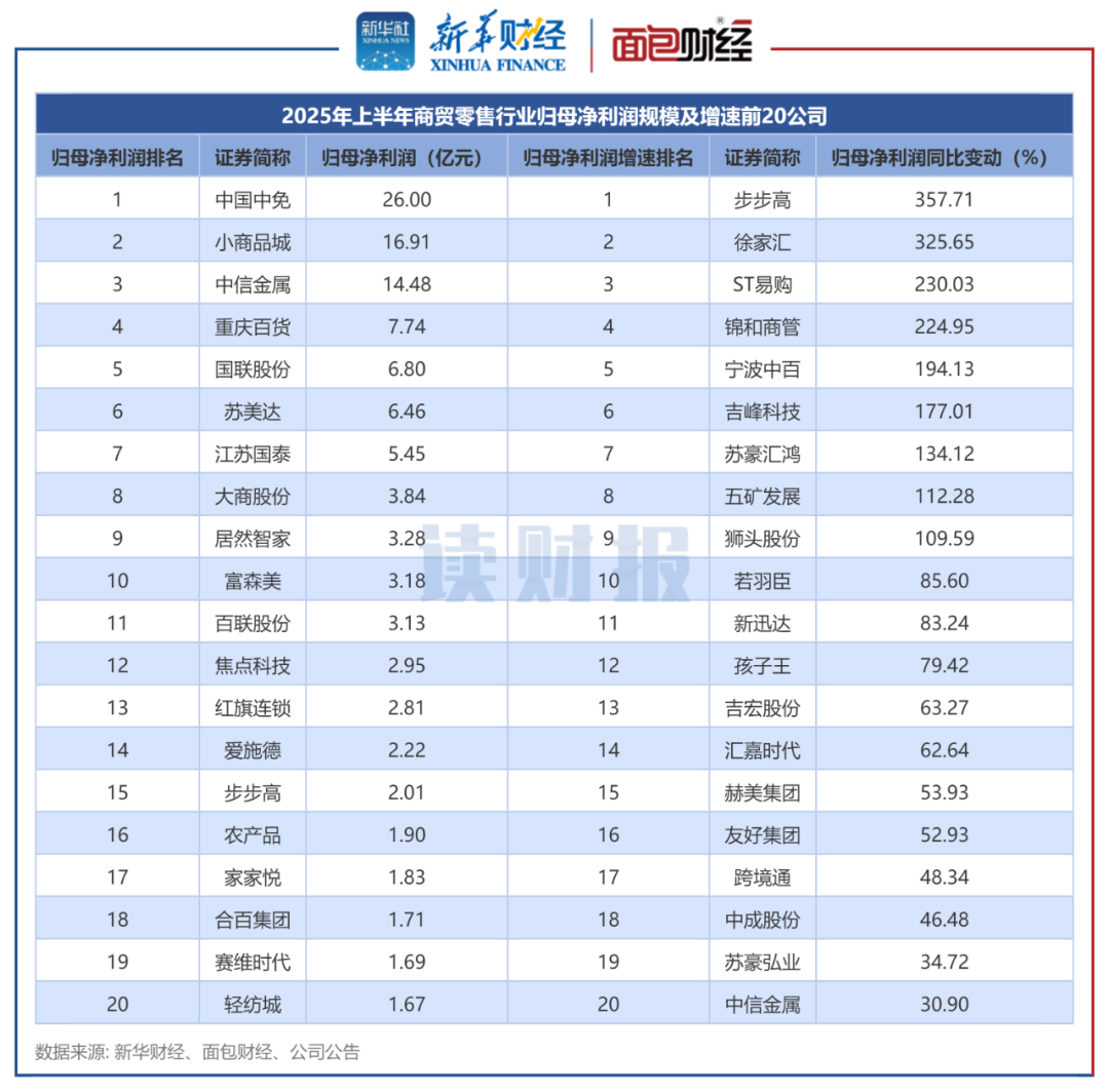 新华财经和面包财经研究员梳理公开资料显示,A股申万一级行业分类为商贸零售的97家企业,2025年上半年合计营收为6065.29亿元、合计归母净利润117.95亿元,同比分别下降8.4%、18.83%。
