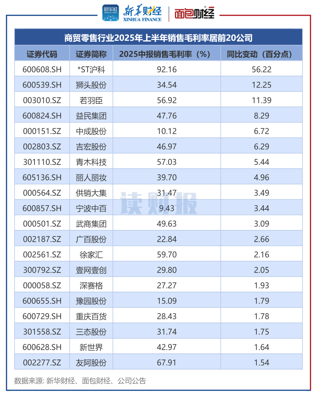 具体来看,*ST沪科、百大集团和焦点科技上半年毛利率位居前三,分别达92.16%、88.26%和80.05%。此外,杭州解百(600814)、富森美(002818)、友阿股份(002277)、丽尚国潮(600738)、美凯龙(601828)等14家公司的毛利率超过50%。较上年同期相比,*ST沪科、狮头股份(600539)、若羽臣(003010)的毛利率增长较快。