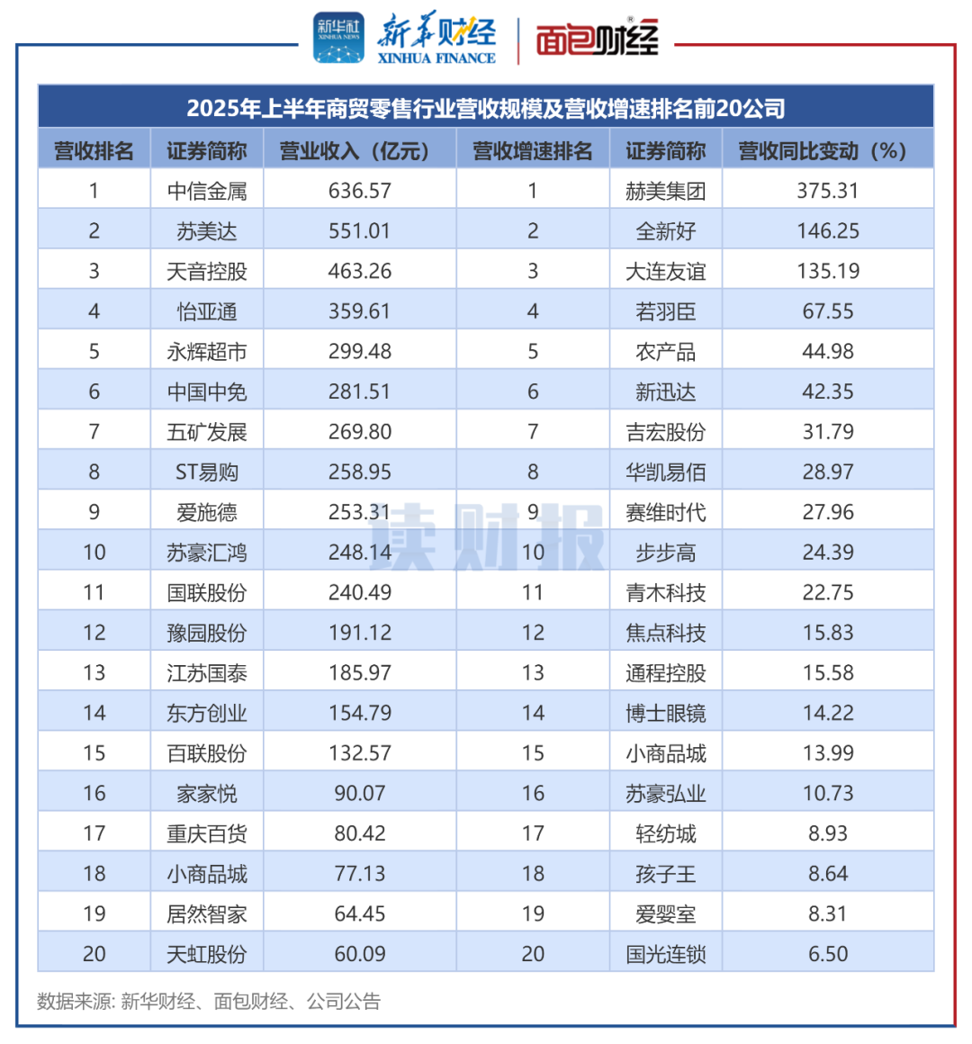 图1:商贸零售行业2025年上半年营收规模及营收增速前20的公司