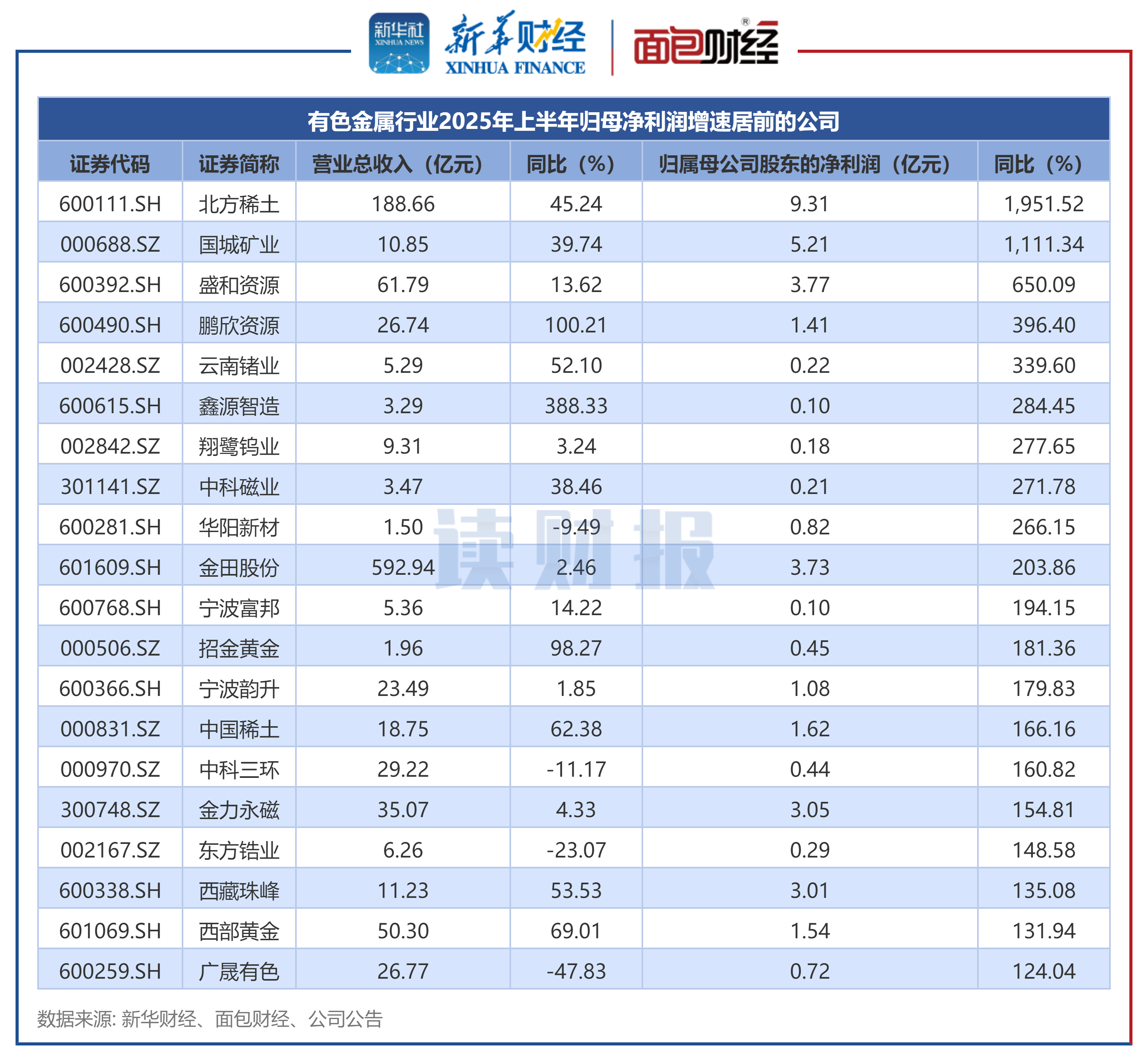 新华财经和面包财经研究员梳理公开资料显示,受益于产品价格上涨,2025 年上半年申万有色金属行业141家企业2025年上半年合计实现营收1.82万亿元,同比增长6.49%;归母净利润合计953.63亿元,同比增长36.55%。