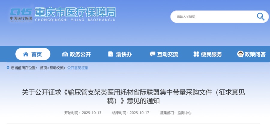 10月13日,重庆市医疗保障局发布《关于公开征求<输尿管支架类医用耗材省际联盟集中带量采购文件(征求意见稿)>意见的通知》(以下简称《意见稿》)。