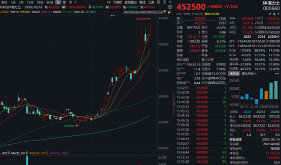 芯片股集体走强,SK海力士涨7.1%,韩美半导体涨超3%,三星电子上涨2.84%。其中,SK海力士、三星电子股价均创出历史新高,市值分别攀升至329万亿元韩元(折合人民币约1.65万亿元)、578万亿韩元(折合人民币约2.9万亿元)。今年年初以来,SK海力士累计涨幅超过160%,三星电子涨超83%。