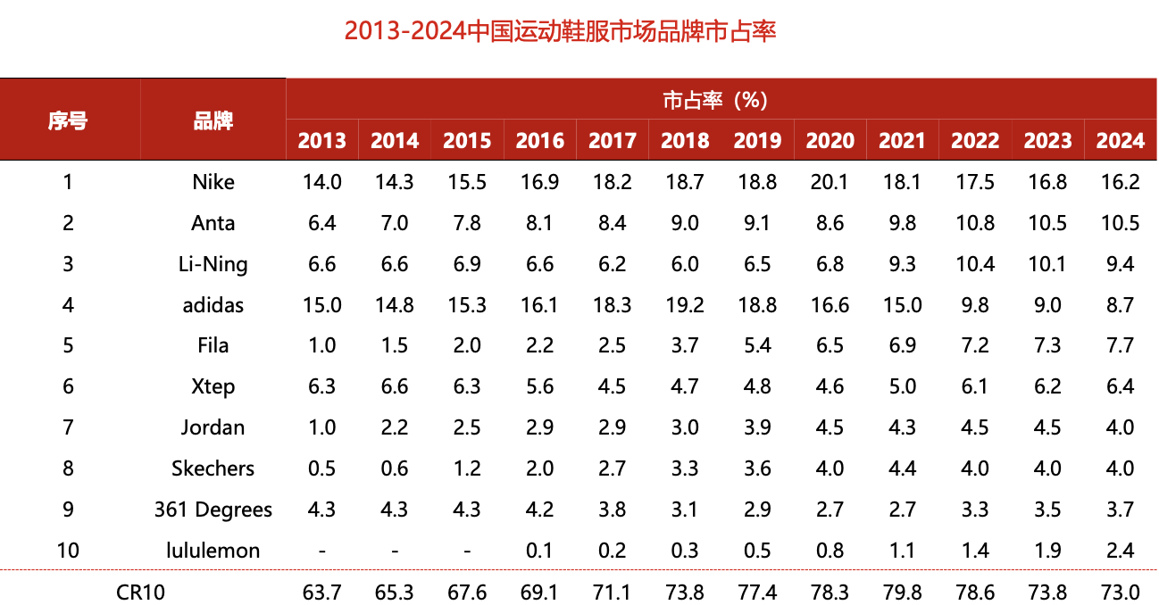 在很长时间范围内,都是耐克与阿迪达斯之争。但在2017年以来,安踏、李宁、FILA等品牌快速崛起,阿迪达斯跌势尤其明显。在2024年,阿迪达斯在华市场占有率已经低于耐克、安踏与李宁。