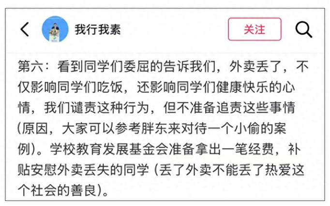 “我们谴责这种行为,但不准备追责……学校教育发展基金会准备拿出一笔经费,补贴安慰外卖丢失的同学。”近日,广西财经学院校长范祚军针对学生反映的外卖丢失问题,在其抖音账号“我行我素”上如是表态,引发热议。范祚军还表示,“丢了外卖,不能丢了热爱这个社会的善良”。
