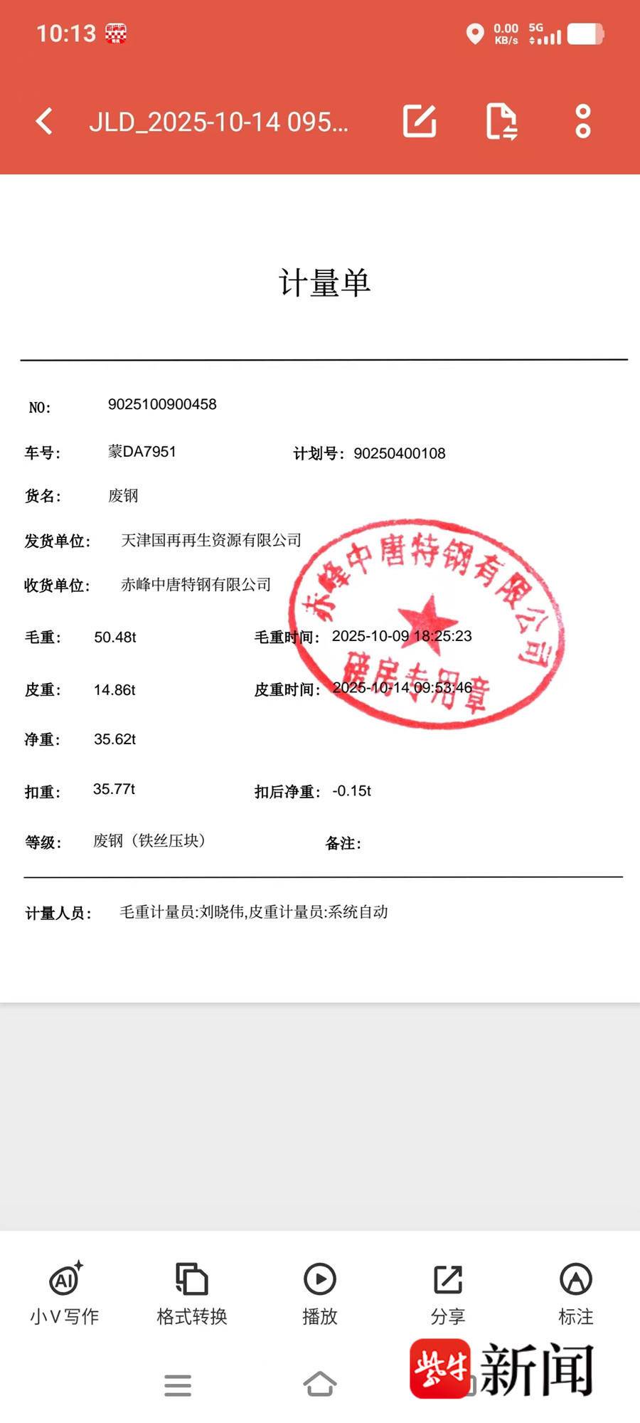 扬子晚报紫牛新闻记者从张瑞井提供的相关证据看到,一张单据显示该批标明“废钢”的货物毛重50.48吨,扣重35.77吨,扣后净重-0.15吨,并加盖“赤峰中唐特钢有限公司磅房专用章”。对此,张瑞井向记者解释称,因为中唐特钢认定该货物掺假,对其进行“没收”这才有“扣后净重-0.15吨”一说,另外还被罚款1000元。