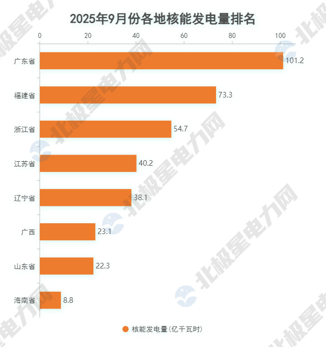 2025年9月,规上核能发电量排在前五的分别是:广东省101.2亿千瓦时、福建省73.3亿千瓦时、浙江省54.7亿千瓦时、江苏省40.2亿千瓦时、辽宁省38.1亿千瓦时。