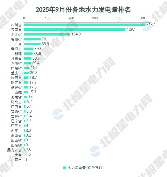 2025年9月,规上水力发电量排在前五的分别是:四川省513.1亿千瓦时、云南省429.1亿千瓦时、湖北省194.9亿千瓦时、贵州省70.1亿千瓦时、广西69.9亿千瓦时。