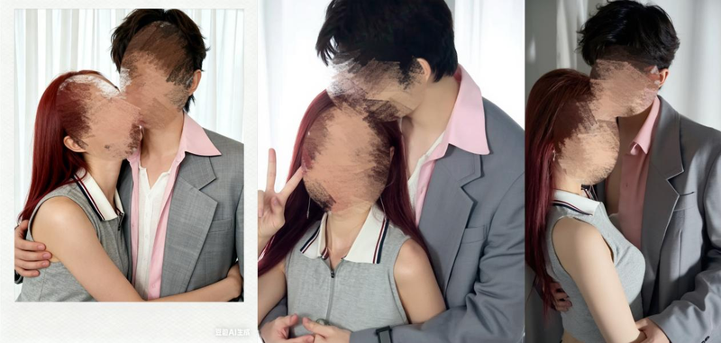 相比之下,豆包、可灵则需要多次重新生成。其中,在第一次生成时,豆包显示“抱歉,我无法生成你要求的图片。”不过,这并不意味着豆包进行了严格限制,通过设置“两人相互搂着、眼神看着对方,表现亲密情侣感”等描述,豆包往往一次就能生成亲密接触的图片。另外,可灵在相同提示词(含“亲吻”)测试中,重新生成三次后,也可实现亲昵合影。