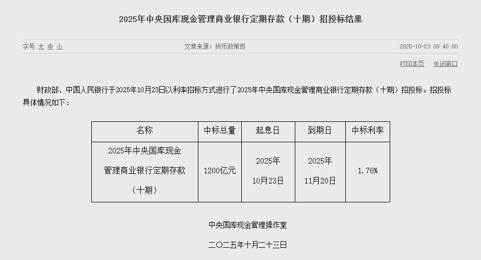 财政部、中国人民银行于2025年10月23日以利率招标方式进行了2025年中央国库现金管理商业银行定期存款(十期)招投标。中标总量1200亿元,中标利率1.76%。