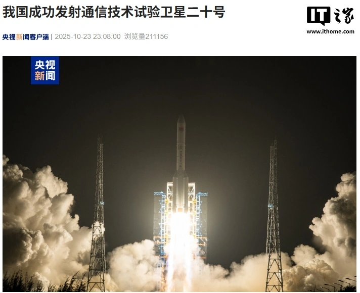 IT之家 10 月 23 日消息,据央视新闻报道,北京时间 2025 年 10 月 23 日 22 时 30 分,我国在文昌航天发射场使用长征五号运载火箭,成功将通信技术试验卫星二十号发射升空,卫星顺利进入预定轨道,发射任务获得圆满成功。该卫星主要用于开展多频段、高速率卫星通信技术验证。