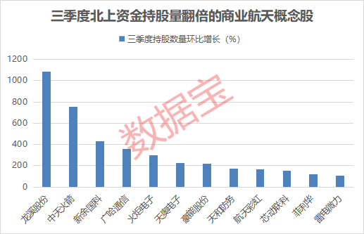 部分商业航天概念股三季度获得外资青睐,30股北上资金持股量环比实现增长,其中龙溪股份(600592)、中天火箭、新余国科(300722)等12股持股量环比增幅在100%以上。