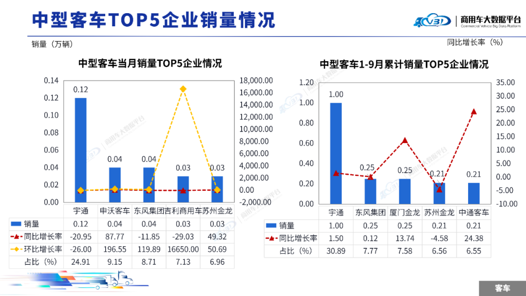 1-9月中型客车累计销量(批发)TOP5企业占比59.35%,依次为宇通、东风集团、厦门金龙、苏州金龙、中通客车。