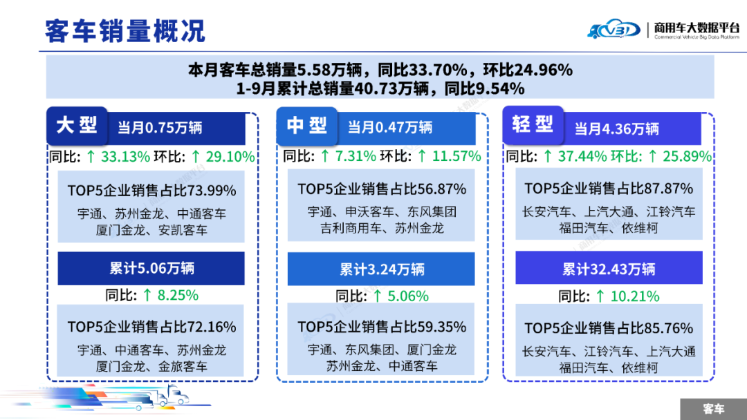 2025年9月客车销量(批发)为5.58万辆,同比增长33.70%,环比增长24.96%;1-9月累计销量(批发)为40.73万辆,同比增长9.54%。