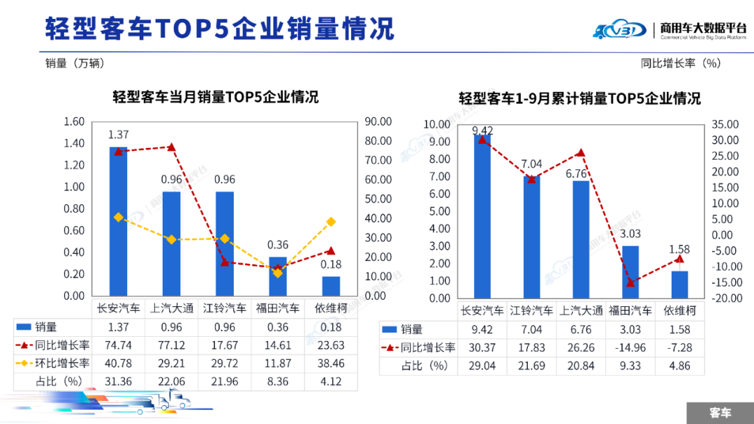 1-9月轻型客车累计销量(批发)TOP5企业占比85.76%,依次为长安汽车、江铃汽车、上汽大通、福田汽车、依维柯。