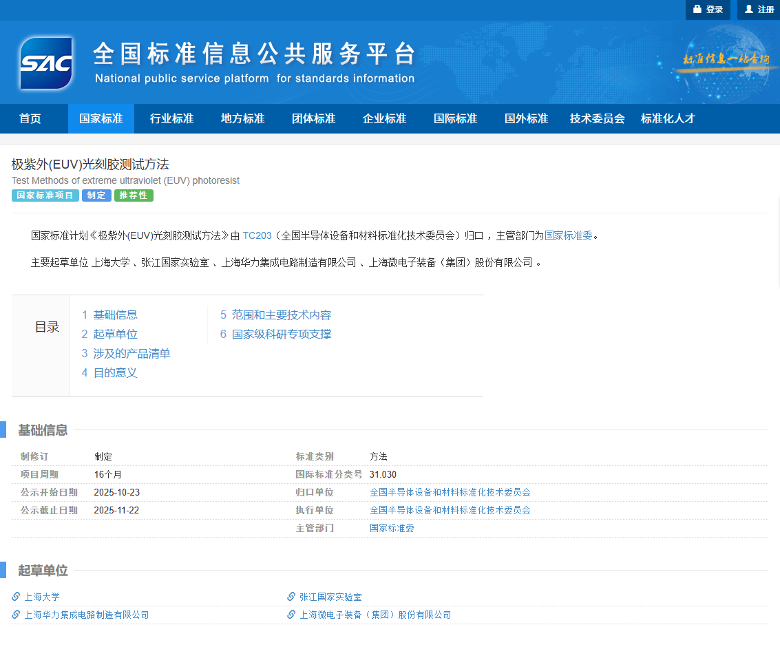 消息面上,我国首个EUV光刻胶标准立项。国家标准委网站显示,我国首个EUV光刻胶标准——《极紫外(EUV)光刻胶测试方法》作为拟立项标准,10月23日开始公示,截止时间为11月22日。标准的起草单位包括上海大学、张江国家实验室、上海华力集成电路制造有限公司、上海微电子装备(集团)股份有限公司。