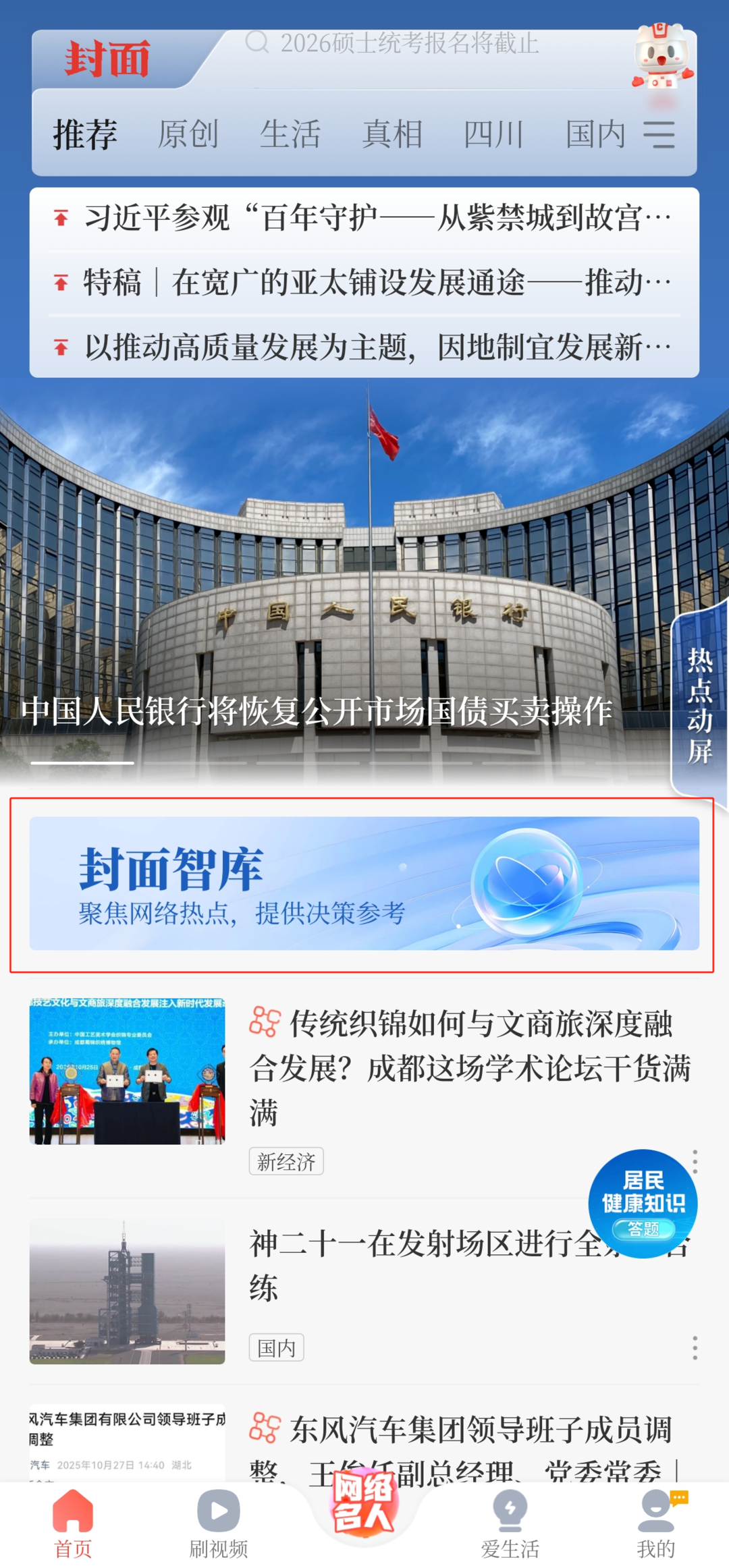 10月28日,同步在封面新闻APP内焕新上线的还有“封面舆情智库2.0版”。该平台在每日实时更新核心内容的同时,形成“热点感知—行业洞察—科技前沿—投资决策—AI报告—直通部委”舆情智库全链条。更有封面舆情智库团队和封面采编团队以独特的媒体视角,对网络热点和重点事件进行的深度分析。用户点击封面新闻客户端首页推荐频道“封面智库”头图,即可进入。