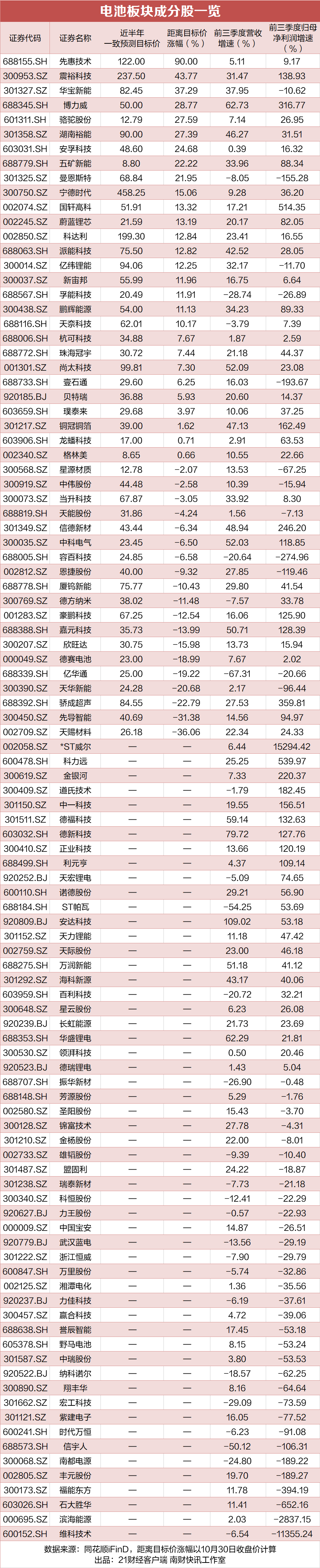 21财经·南财快讯记者梳理发现,截至10月30日收盘,先惠技术(688155.SH)、震裕科技(300953)(300953.SZ)、华宝新能(301327)(301327.SZ)的股价距离目标价涨幅空间最大,而宁德时代(300750)(300750.SZ)、亿纬锂能(300014)(300014.SZ)、科达利(002850)(002850.SZ)等相对热门股票的股价距离目标价仍存在超10%空间。