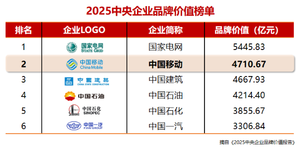 11月5日,据中国移动(600941)(600941.SH)官微消息,11月3日,由国务院国资委指导主办的第八届中国企业论坛品牌建设平行论坛在北京举办。论坛期间,“2025中央企业品牌价值TOP60”榜单揭晓,其中,国家电网以5445.83亿元的品牌价值位列央企第一;中国移动品牌价值达4710.67亿元,位列行业第一、央企第二。此外,三大运营商中,中国联通(600050)、中国电信(601728)在中央企业品牌价值榜单中分别位列第10位、15位。