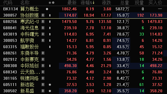 除寒武纪-U外,海光信息、中芯国际、通富微电(002156)、芯原股份、龙芯中科等AI芯片概念股也有不同程度上涨。