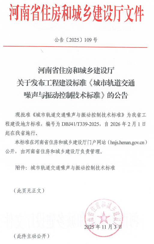 近日,河南省住房和城乡建设厅发布工程建设标准《城市轨道交通噪声与振动控制技术标准》DBJ41/T339-2025,自2026年2月1日起施行。该标准由郑州交通发展投资集团有限公司主编,北京九州一轨环境科技股份有限公司作为主要参编单位,全程参与该标准的编制工作。