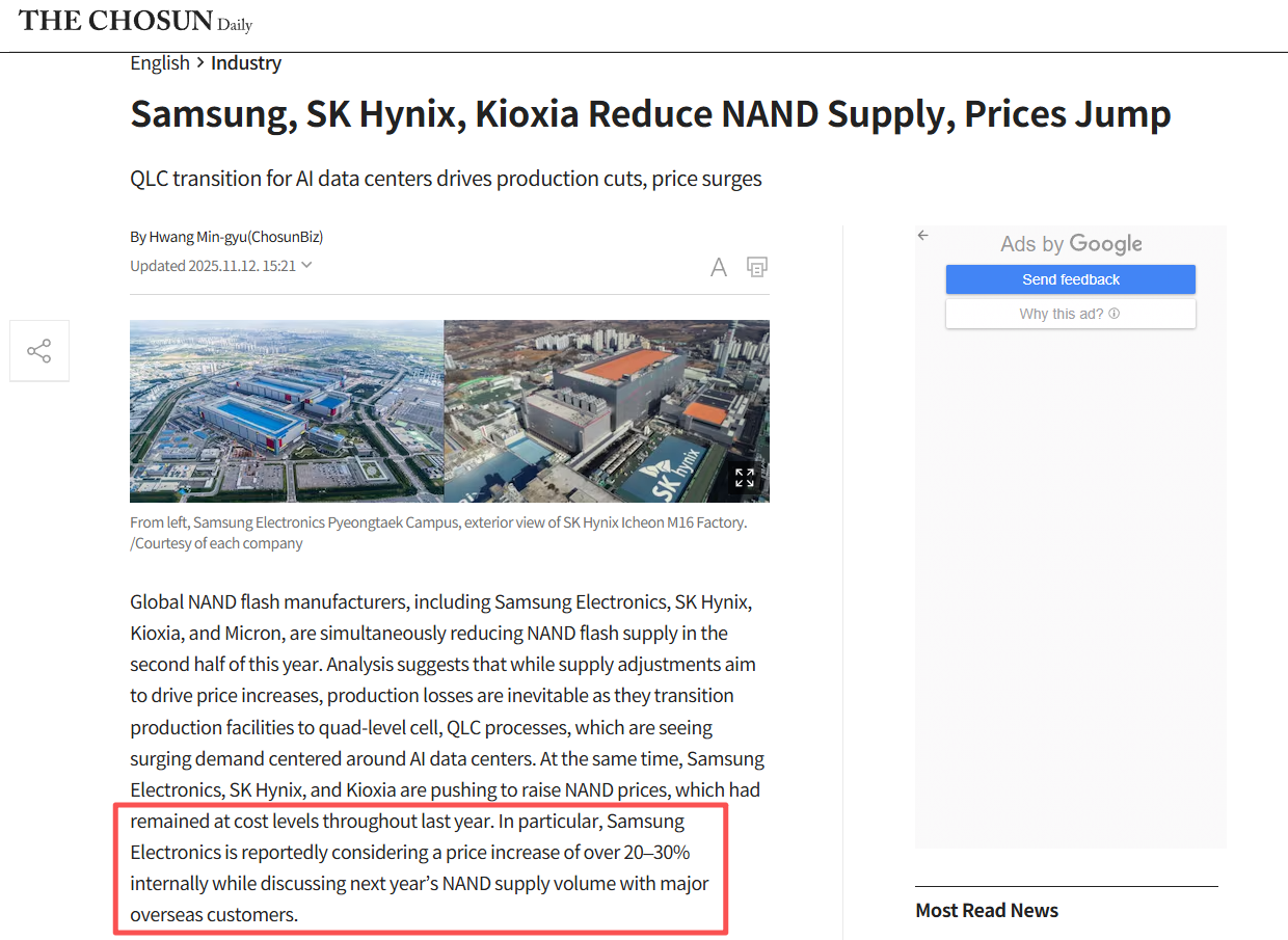 11月12日,据《朝鲜日报》报道,全球NAND闪存制造商包括三星电子、SK海力士、Kioxia(铠侠)和Micron(美光)在内,今年下半年同时减少NAND闪存的供应。分析显示,虽然供应调整旨在推动价格上涨,但随着它们将生产设施转型为四层级单元(QLC)工艺,生产损失是不可避免的。这种工艺正受到围绕AI数据中心的激增需求的推动。