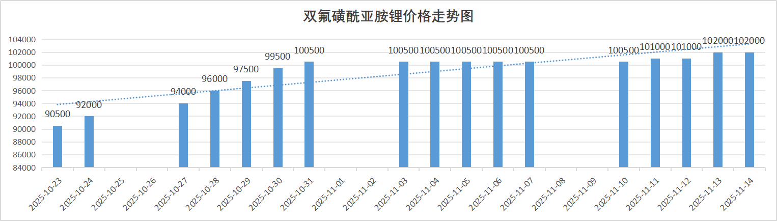 上证报记者11月14日从SMM(上海有色)最新获悉,14日,双氟磺酰亚胺锂(LiFSI,简称“双氟”)市场价格已攀升至10.2万元/吨;自10月23日触及9.05万元/吨的阶段性低点后,该产品价格开启快速反弹通道,短期内上涨明显。