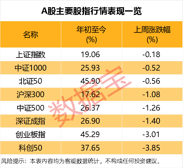 本周(11月10日至14日),A股市场震荡调整,日成交规模维持在1.9万亿元上方。指数方面,上证指数一周下跌0.18%,最新报3990.49点;深证成指下跌1.40%,创业板指下跌3.01%。科创50指数上周下跌3.85%,为周跌幅最高的主要指数。