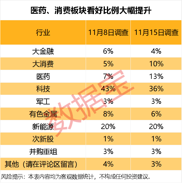 医药、大消费板块看好比例大幅提升,分别环比提升6个百分点、5个百分点。