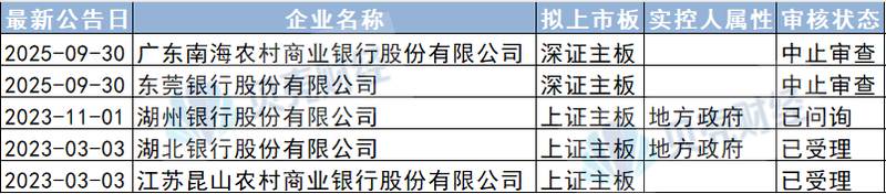 其中,拟赴深交所上市的广东南海农商行、东莞银行审核状态为中止审查,最新状态更新在一个多月前。拟赴上交所上市的湖州银行、湖北银行、江苏昆山农商行审核状态分别是已问询、已受理、已受理,均停滞近两年。