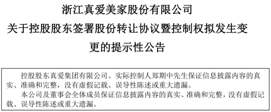 停牌数日后,11月11日晚间,真爱美家公告披露,公司控股股东真爱集团及实控人郑期中与广州探迹远擎签署协议,真爱集团拟将其持有的公司无限售流通股约4318.56万股(占总股本29.99%)转让给探迹远擎,转让价格确定为27.74元/股,股份转让价款总额(含权价)近12亿元。交易完成后,公司控股股东将变更为探迹远擎,实控人将变更为探迹投资创始人黎展。