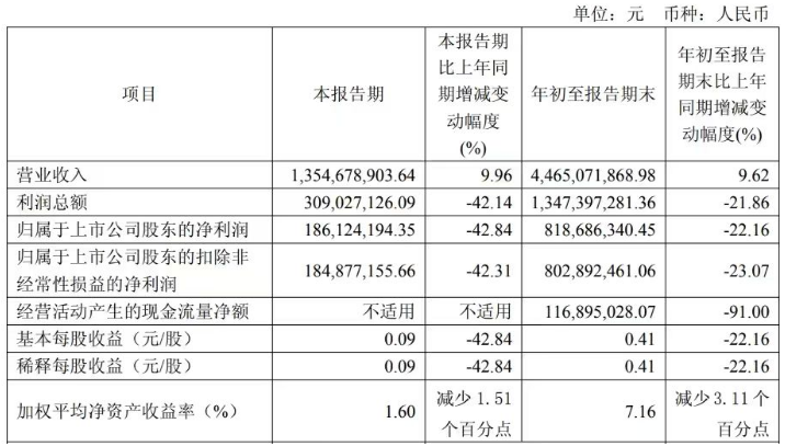 天坛生物作为国内血制品龙头企业,其三季度与前三季度的业绩数据均直观反映了行业困境。从单季度来看,公司三季度实现营业收入约13.55亿元,同比增长9.96%,但归属上市股东的净利润仅为1.86亿元,同比大幅下降42.84%;前三季度累计实现营业收入44.65亿元,同比增长9.62%,归母净利润8.19亿元,同比下降22.16%,单季度利润降幅显著大于累计降幅。