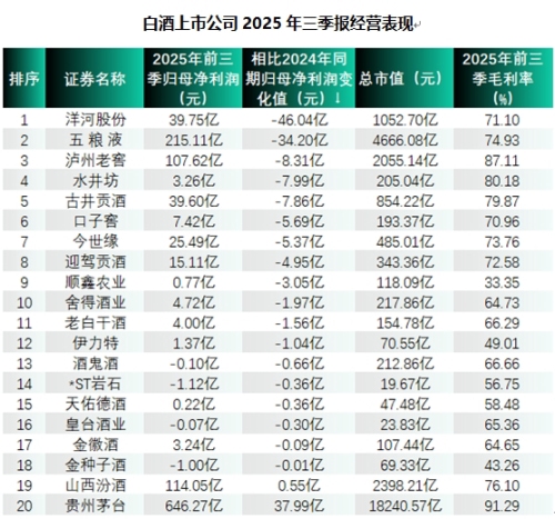 以洋河股份(002304)为例,2025年前三季度实现规模净利润39.75亿元,与2024年同期的85.79亿元相比,归母净利润减少了46.04亿元,在20家白酒企业中,减少金额位居首位。