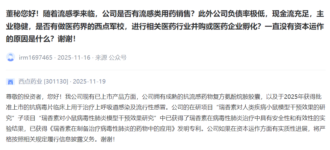 西点药业(301130) [301130] :我公司现有已上市产品方面,公司拥有成熟的抗流感药物复方氨酚烷胺胶囊,以及于2025年获得批准上市的抗病毒片临床上用于治疗上呼吸道感染及流行性感冒。公司的在研项目“瑞香素对人类疾病小鼠模型干预效果的研究”子项目“瑞香素对小鼠病毒性肺炎模型干预效果研究”中已获得了瑞香素在病毒性肺炎治疗中具有安全性和有效性的实验结果,已获得《瑞香素在制备治疗病毒性肺炎的药物中的应用》发明专利。公司如果在资本运作方面有实质性进展,将严格按照相关规定履行信息披露义务。