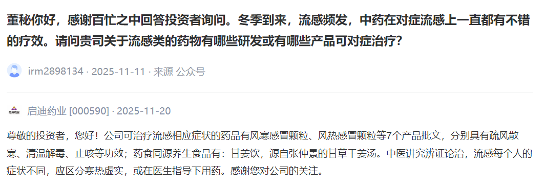 目前药企应对流感情况如何?各家公司是否推出新产品应对流感?流感相关产品销售情况怎样?全景为您精选来自上市公司最真实的声音。(以下内容均摘自深交所互动易、上证e互动、上市公司公告等)