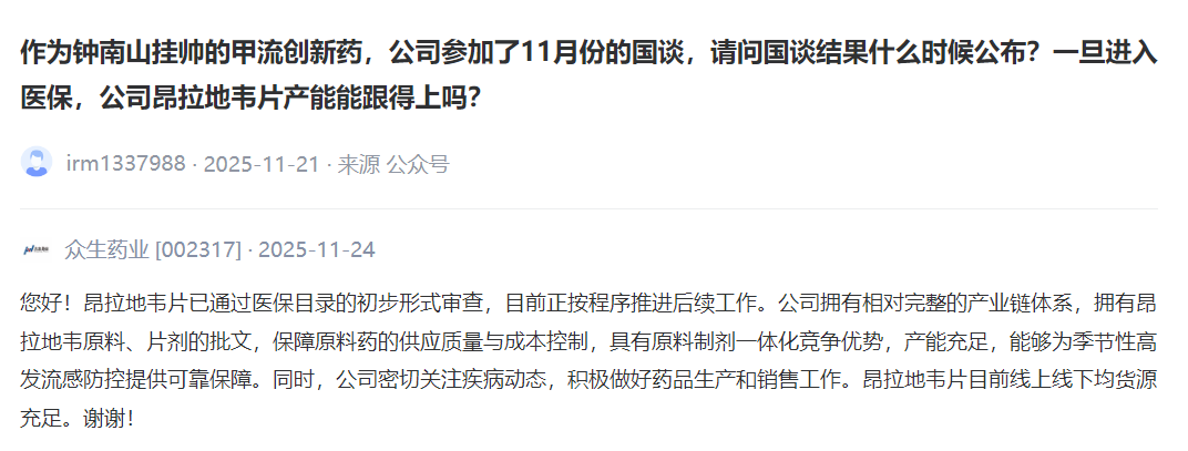 众生药业 [002317] :昂拉地韦片已通过医保目录的初步形式审查,目前正按程序推进后续工作 。公司拥有相对完整的产业链体系,拥有昂拉地韦原料、片剂的批文,保障原料药的供应质量与成本控制,具有原料制剂一体化竞争优势,产能充足,能够为季节性高发流感防控提供可靠保障。同时,公司密切关注疾病动态,积极做好药品生产和销售工作。昂拉地韦片目前线上线下(300959)均货源充足。