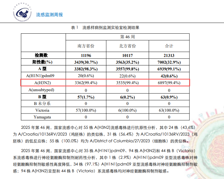 中国疾控中心流感监测最新周报数据显示,2025年第46周,甲型H3N2病毒在我国依然占有流行优势,现阶段检出的病原体均为已知常见病原体,没有发现未知病原体及其导致的新发传染病。