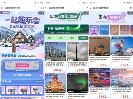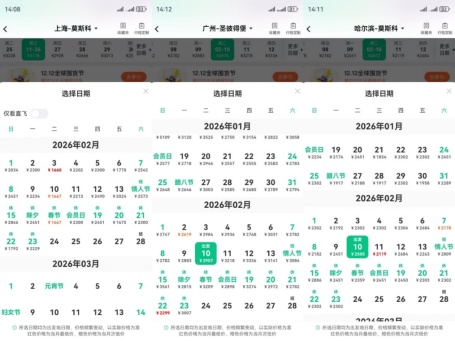 同程旅行平台上,正在推出旅游冰雪季特惠,最高可领取600元东北红包、1500元欧洲红包等。俄罗斯、挪威、芬兰和冰岛都是热门的出境玩雪目的地。“9天7晚圣彼得堡+莫斯科+俄罗斯+谢镇+冬宫+克宫+夏宫花园跟团游”“9天7晚.摩尔曼斯克+莫斯科+圣彼得+萨米村+追光之旅+摩尔曼跟团游”“8天6晚.春节热卖免签俄罗斯莫斯科+尔曼斯克双城4飞8日三次追光体验”都是热门线路,热门团期主要集中在明年1月和2月。相较于其他北欧国家的极光路线,俄罗斯的性价比尤为突出,成本可低至一半甚至以上。