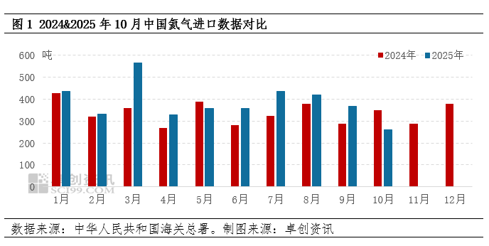 受欧洲某国家主产区装置检修以及进口均价上涨等影响,2025年10月中国氦气进口量减少。据海关数据显示,10月氦气进口量在260.026吨,环比减少29.28%,较去年同期减少25.69%。10月氦气进口均价在87.36美元/公斤,环比涨6.48%,同比跌14.6%。