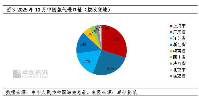 按收货地来看,2025年10月中国进口氦气地区主要为上海、广东,两者占比56%。上海排名第一,进口77.77吨,占比30%,较9月减少1.17%。广东进口66.868吨,占比26%,较9月减少1.16%。江苏进口44.429吨,占比17%,较9月减少30.97%。浙江进口量在37.43吨,占比14%,较9月减少52.44%。海南进口12.71吨,较9月减少3.93%,占比在5%。四川、陕西分别进口8.8吨、7.14吨,占比均在3%。北京、福建还有少量进口,累计占比2%。总体来看,相比9月各收货地排名变化较大,山东、河北、重庆无进口,新增四川、福建两个收货地。