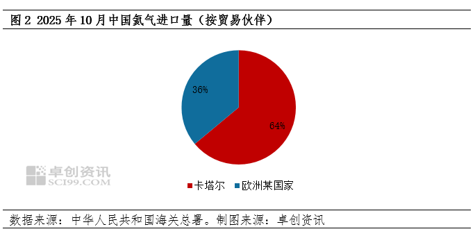 按贸易伙伴来看,2025年10月中国氦气自卡塔尔、欧洲某国家进口量均有减少。具体来看,卡塔尔进口量最大,共进口166.282吨,较9月减少29.85%,占总进口量的64%,排名第一,本月卡塔尔进口均价上涨9.82%至100.8美元/公斤,影响资源外放量。欧洲某国家进口量占比在36%,较9月减少28.04%至93.744吨,排名第二,其进口量大幅减少主要是阿穆尔主产区装置检修所致。