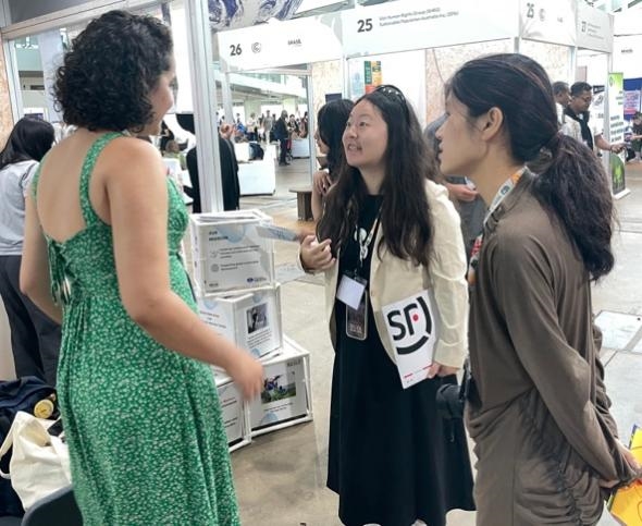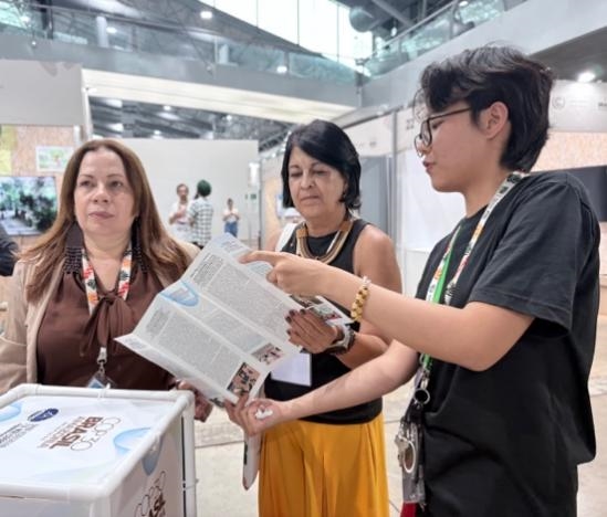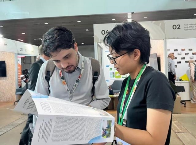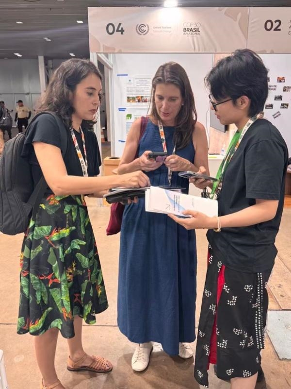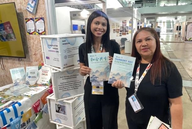 由中国民促会实施的“青年绿色发展”项目支持两位青年代表訾晨曦、刘浩平参加COP30,她们在展台介绍了各自开展的气候行动,分别是“海草床生态保护与气候科普:基于公众参与的桌游工具开发与行动研究”以及“鄠邑区蔡家坡村葡萄园气候生命经验调研与艺术转化行动”,并与来自世界各地关心气候议题的青年代表交流行动经验,发挥青年女性领导力。
