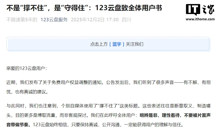 IT之家 12 月 2 日消息,123 云盘于 11 月 26 日发布免费用户权益调整通知,遏制“羊毛党”行为,取消游客身份下载小于 100MB 文件免费权益、限制全端流量等,引发网友热议。