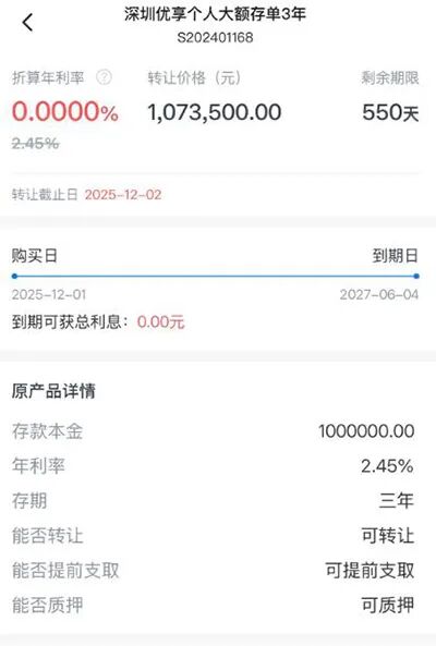更极端的是,记者曾见到两张转让后年利率标为0.0000%的存单,本金分别为20万和100万元,原利率为2.15%和2.45%,剩余期限却长达767天和550天。这意味着,买家若接手,持有期内将“颗粒无收”。相比同期普通定存,潜在利息损失分别超过4400元和1.4万元。