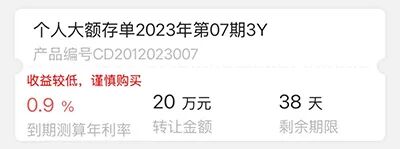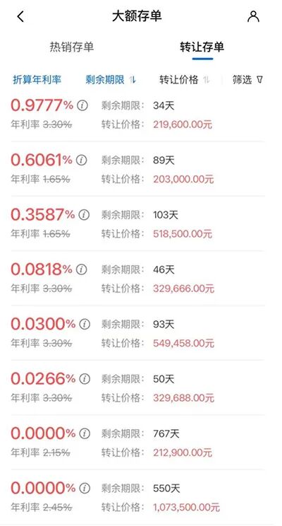 其中,一张存款本金30万元,原年利率3.30%,剩余期限46天的大额存单,转让后年利率仅为0.0818%,买家到期仅得34元利息;另一张50万元,原年利率3.30%、剩余93天的存单,转让后年利率0.03%,到期利息仅42元;另有一张30万元,原年利率3.30%,剩余期限50天的存单,正以0.0266%的折算年利率进行转让,买家持有到期可获得利息12元。