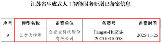 12月2日,国家互联网信息办公室公布最新一批生成式人工智能服务备案名单,企查查自主研发的“汇智”AI大模型正式通过备案(备案号:Jiangsu-HuiZhi-202510310058),吹响了其全力拥抱AI,All-in AI的重要里程碑。