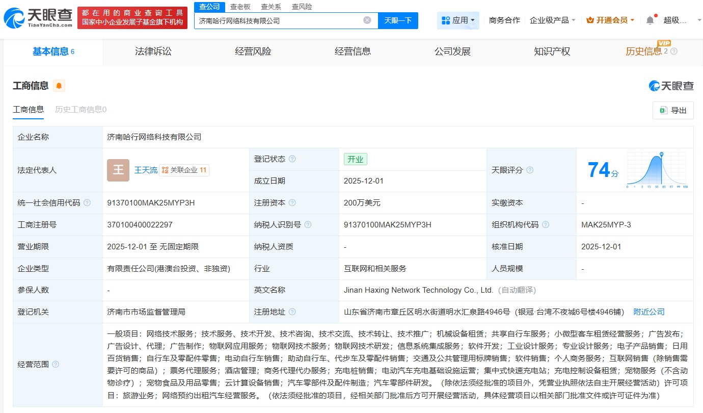 每经AI快讯,天眼查App显示,近日,济南哈行网络科技有限公司成立,法定代表人为王天流,注册资本200万美元,经营范围包括共享自行车服务、小微型客车租赁经营服务、汽车零部件及配件制造、集中式快速充电站等。股东信息显示,该公司由哈啰出行旗下HongKongRideTechLimited全资持股。